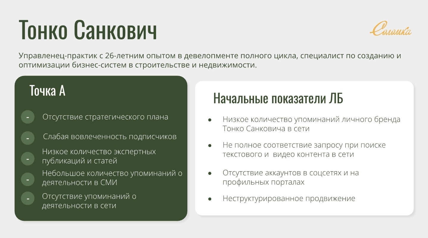 - Интервью и аудит: провели серию глубинных интервью с Тонко для выявления его уникального ценностного предложения, ключевых компетенций и личной истории. Выполнили аудит текущего цифрового следа.