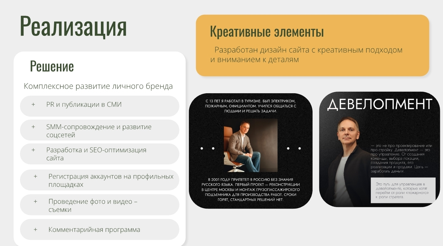- Визуальная идентификация и контент-портфолио: организовали и провели профессиональную фотосъемку. Качественные, «живые» кадры сформировали портфолио, которое работает на формирование имиджа уверенного, опытного и открытого эксперта.