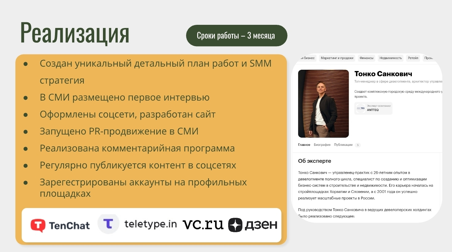 Клиент: Тонко Санкович — управленец-практик с 26-летним опытом в девелопменте полного цикла. Специалист по созданию и оптимизации бизнес-систем в строительстве и недвижимости. Его карьера началась на стройплощадках Хорватии и Словении, а с 2001 года он успешно реализует масштабные проекты в России, занимая топ-позиции в ведущих девелоперских холдингах