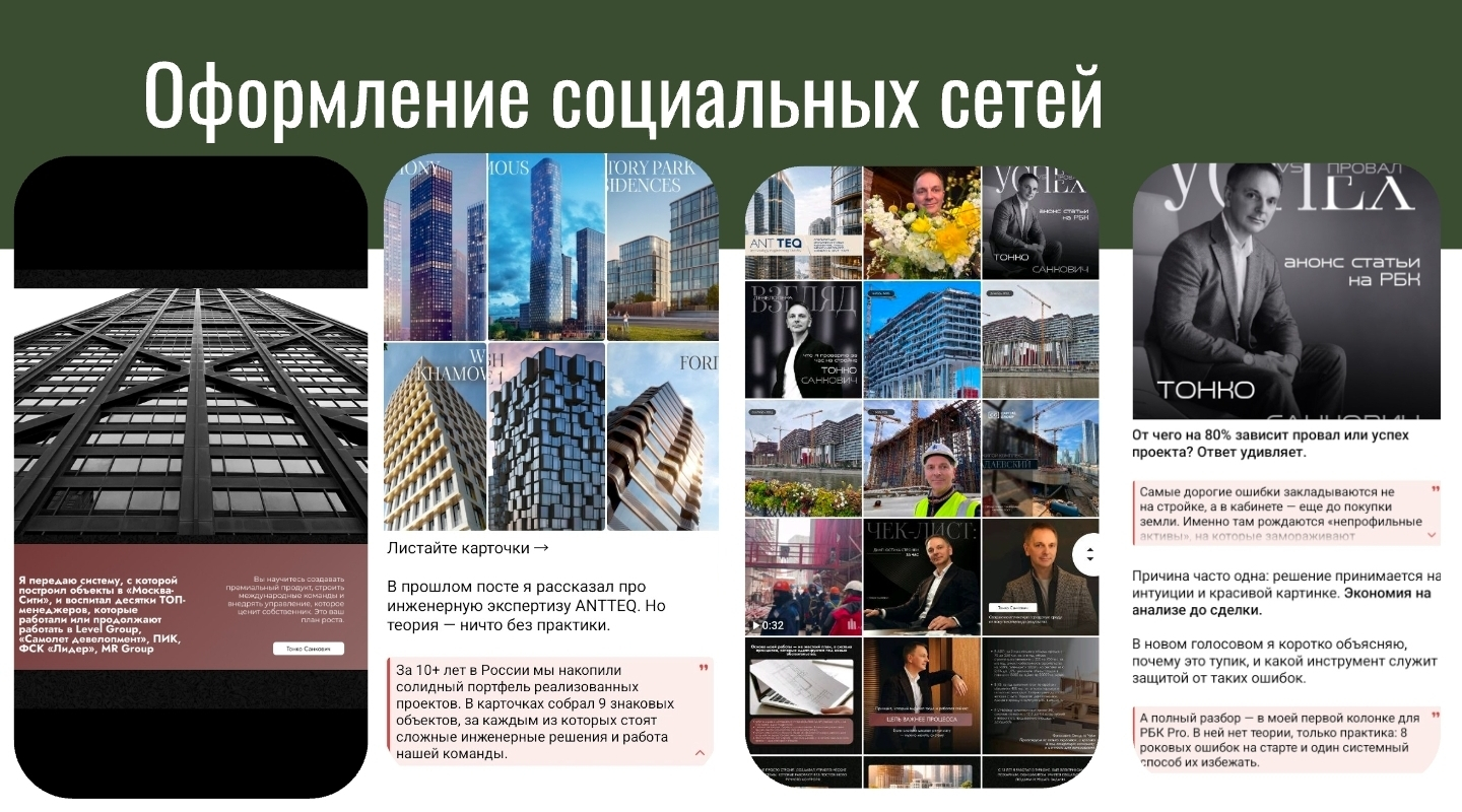 - Исследование рынка и конкурентный анализ: тщательно проанализировали нишу девелопмента, изучили, как представлены другие топ-менеджеры и эксперты, выявили «белые пятна» и точки дифференциации для бренда Тонко.