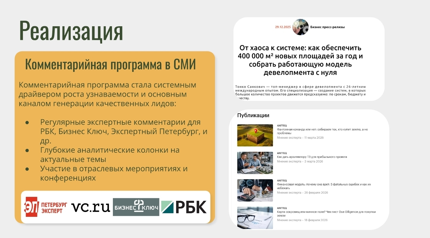 Ключевым драйвером роста узнаваемости и основным каналом генерации качественных лидов стала системная комментарийная программа в СМИ. Ведь для аудитории девелоперов и заказчиков нет ничего убедительнее, чем мнение эксперта, подтвержденное авторитетным изданием.
