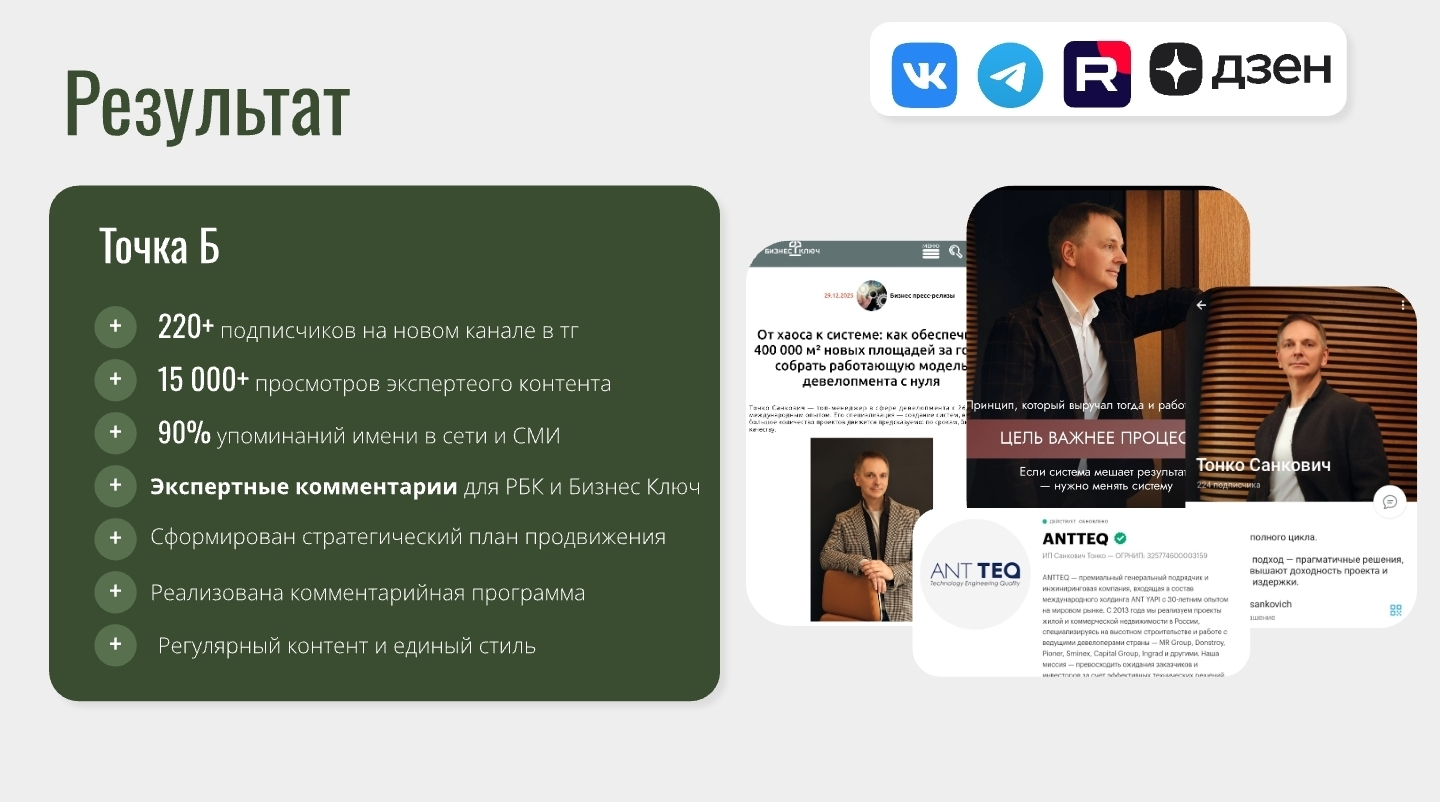 Всего за 3 месяцев системной работы личный бренд Тонко Санковича претерпел кардинальную трансформацию. Ситуация изменилась с «полного отсутствия» до устойчивого и узнаваемого присутствия в ключевых для его сферы каналах.