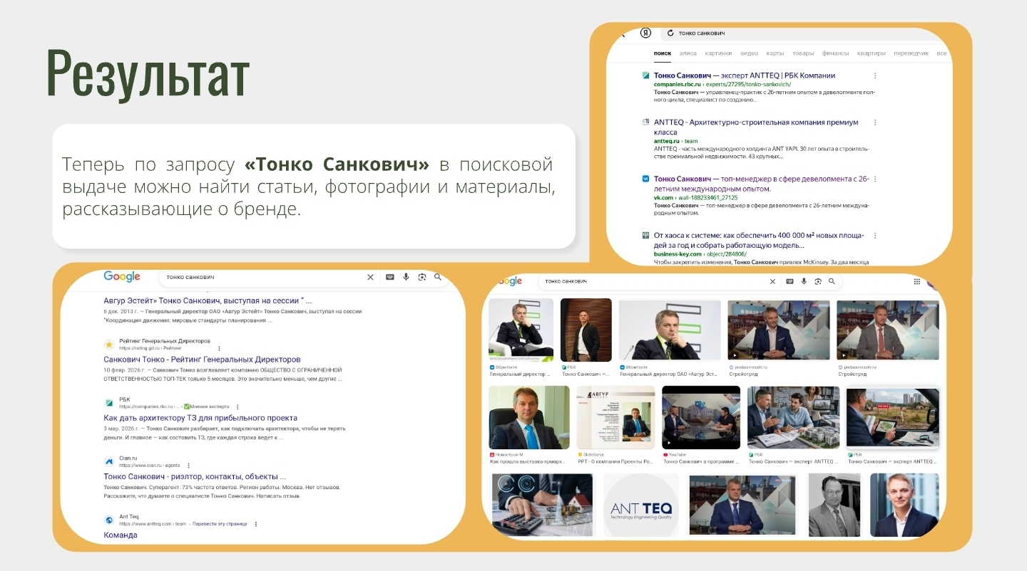- Цифровой след как неоспоримое доказательство экспертизы: по запросу «Тонко Санкович» в поисковой выдаче теперь находится множество статей, интервью, профилей на VC.ru и других площадках, а также ссылки на личный сайт и соцсети. Информационный вакуум сменился полной и контролируемой картиной.