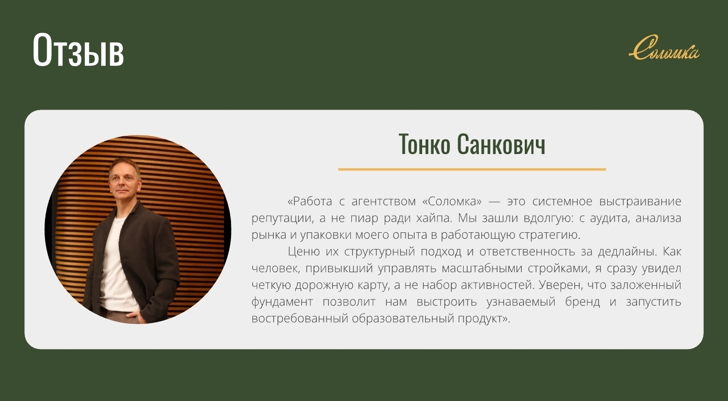 - Система, а не активности. Кейс Тонко Санковича — яркое подтверждение тому, что успех в продвижении личного бренда топ-уровня заключается не в разовых действиях, а в создании целостной системы. Каждый этап — от аналитики до PR — усиливает предыдущий, создавая синергетический эффект.