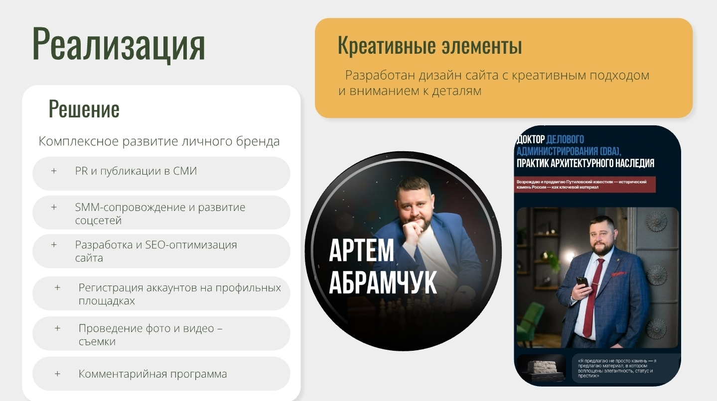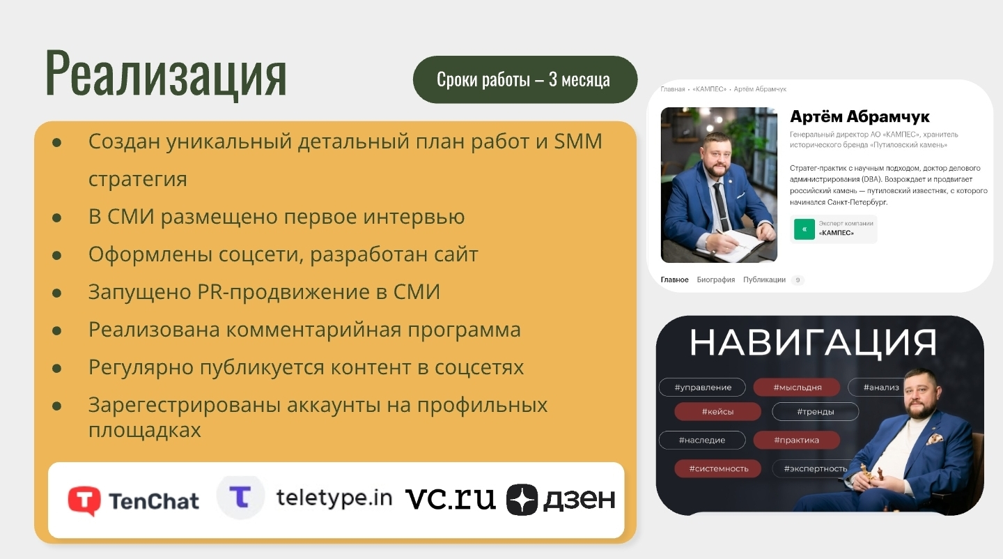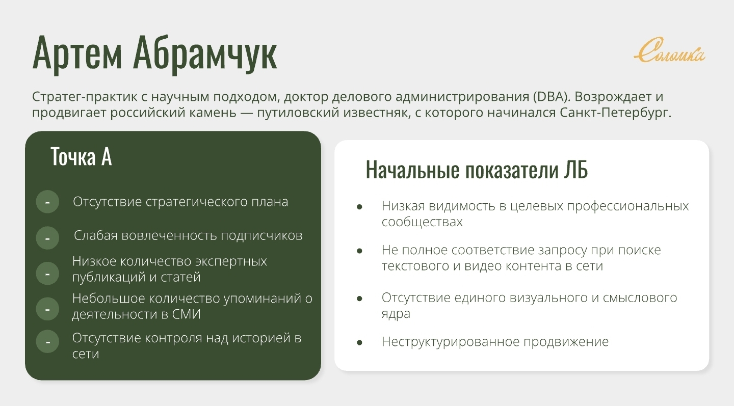 Клиент: Артём Абрамчук — генеральный директор АО «КАМПЕС», хранитель исторического бренда «Путиловский камень». Стратег-практик с научным подходом, доктор делового администрирования (DBA). Развивает и продвигает российский камень — путиловский известняк, с которого начиналась архитектура Санкт-Петербурга.