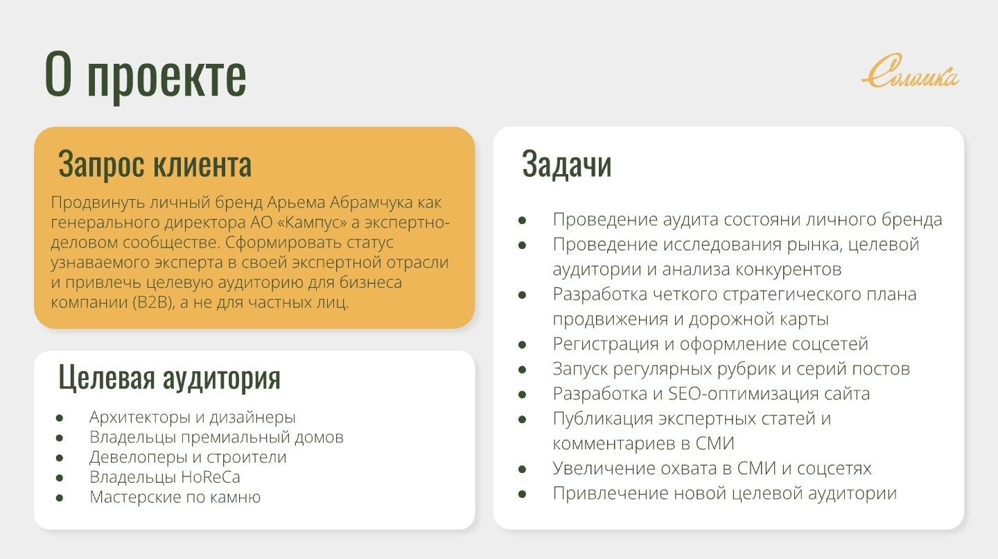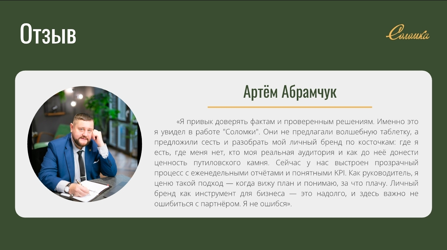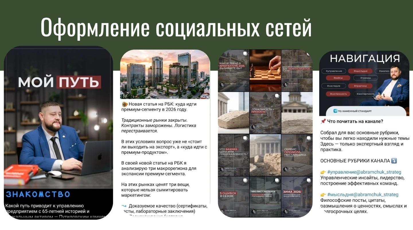 Клиент: Артём Абрамчук — генеральный директор АО «КАМПЕС», хранитель исторического бренда «Путиловский камень». Стратег-практик с научным подходом, доктор делового администрирования (DBA). Развивает и продвигает российский камень — путиловский известняк, с которого начиналась архитектура Санкт-Петербурга.