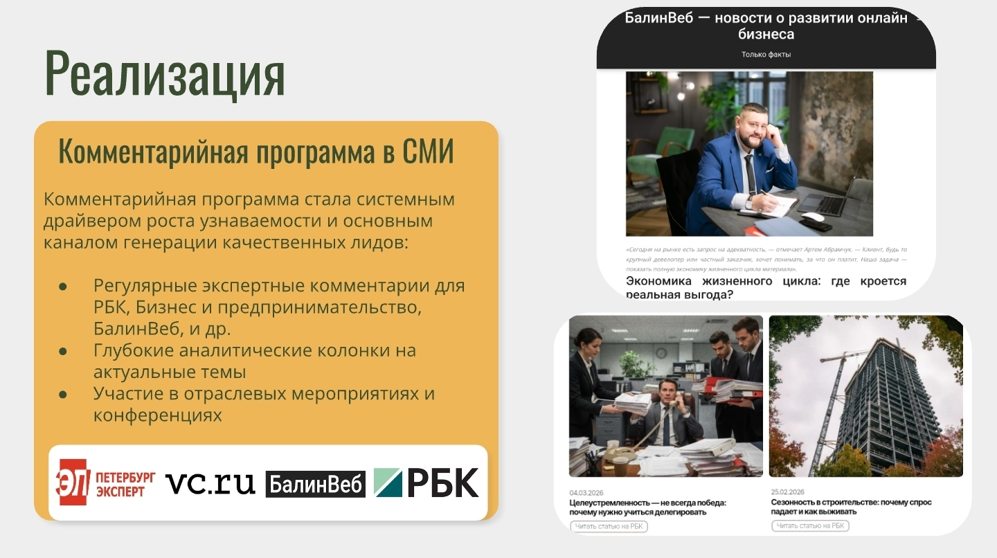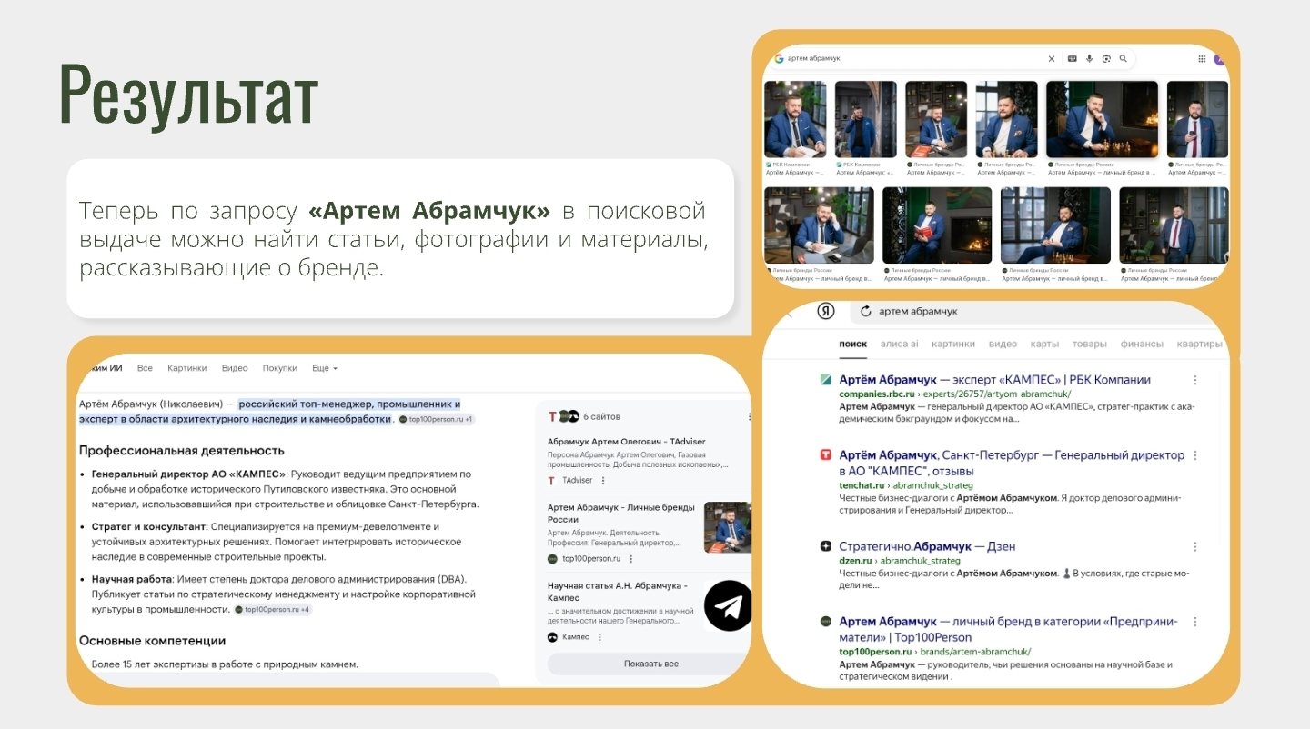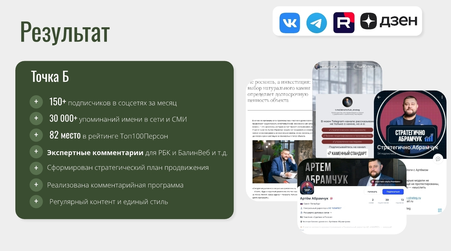 За 3 месяца системной работы личный бренд Артёма Абрамчука был трансформирован из разрозненного присутствия в выстроенный и управляемый актив. Сформирована стратегия продвижения, создана полноценная digital-инфраструктура, запущена регулярная контентная система и комментарийная программа в СМИ. Это позволило закрепить экспертный статус, усилить доверие со стороны B2B-аудитории, выстроить устойчивое медиаприсутствие и превратить личный бренд в инструмент привлечения партнеров и развития бизнеса.