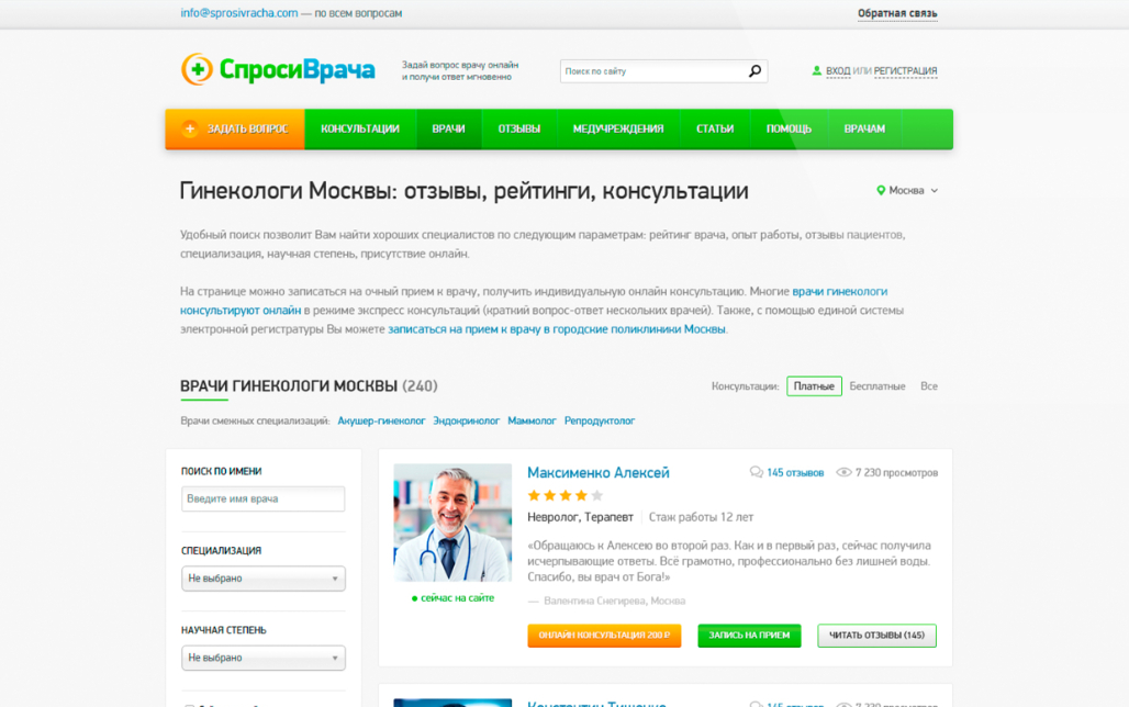 У врачей периодически пересчитывается рейтинг по большому количеству параметров: количеству ответов на вопросы пользователей, времени на сайте, отзывам, заполненности профиля.