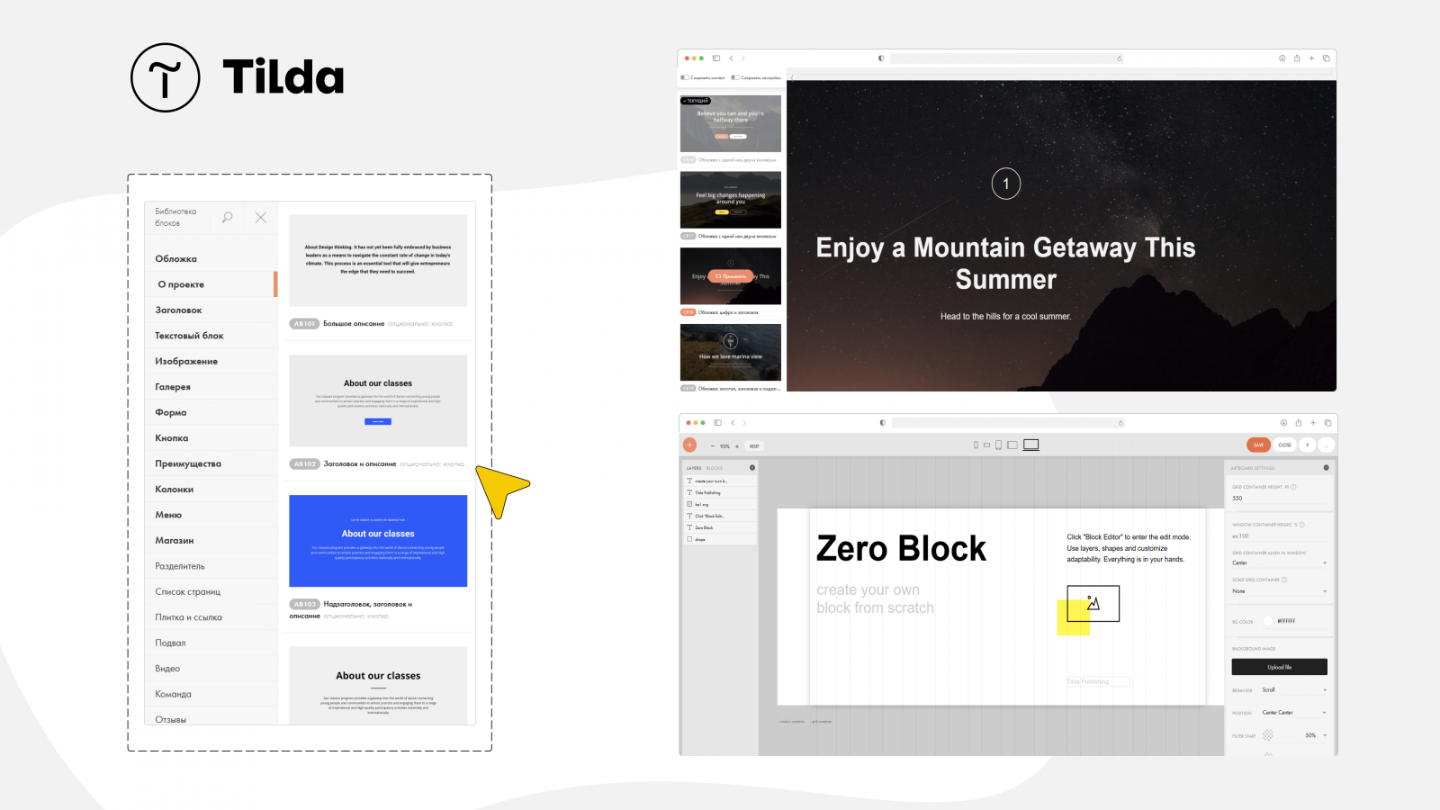 Отличие Тильды от других конструкторов в интуитивно понятном редакторе блоков, который позволяет создать страницы без навыков программирования: лендинги, интернет-магазины и сайты-визитки.