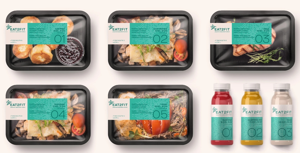 Несмотря на наличие двух основных цветов бренда, бежевого и бирюзового, разнообразие блюд Eat2Fit проявилось в широком спектре насыщенных красок. Каждому суточному рациону соответствует определенный тон, в который окрашены этикетки на контейнерах. Такая система визуальной идентификации помогает потребителям в считанные секунды выбрать блюда текущего дня. Деление по цветам предотвращает путаницу, которая может возникнуть среди большого количества контейнеров.