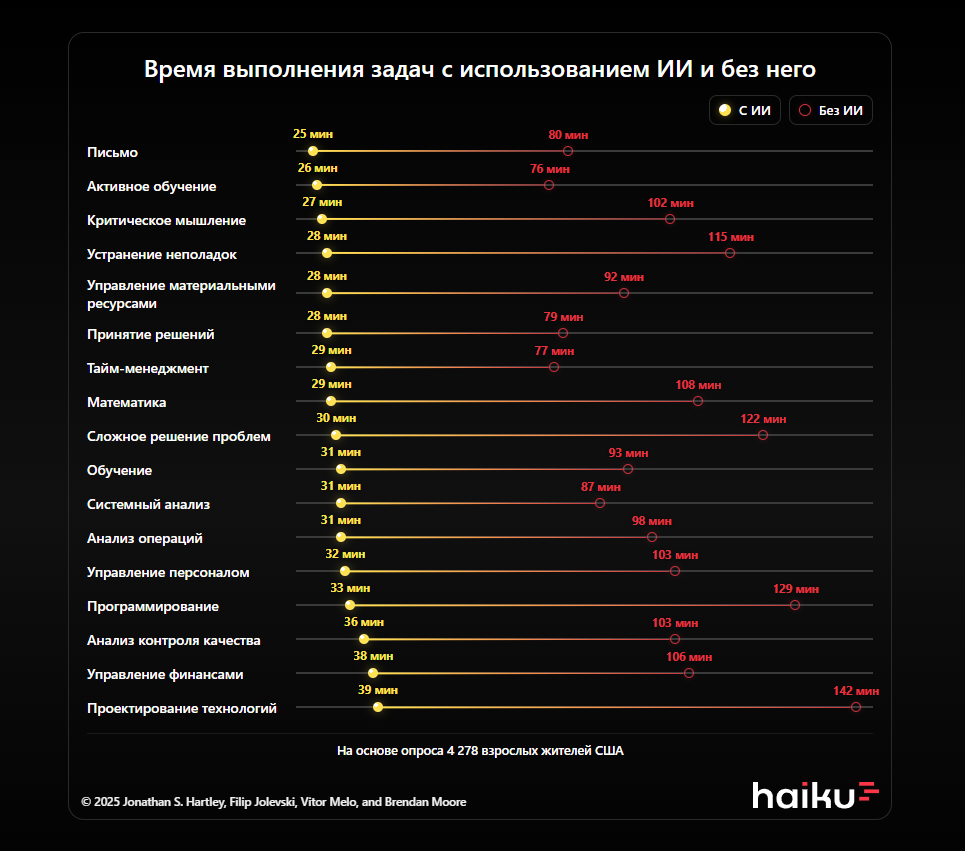 - Сотрудники, использующие ИИ для стандартных задач, сокращают время работы с 90 до 30 минут. Это касается не только программирования и написания текстов. Такой эффект отмечают специалисты из разных областей — маркетинга, HR и обучения.