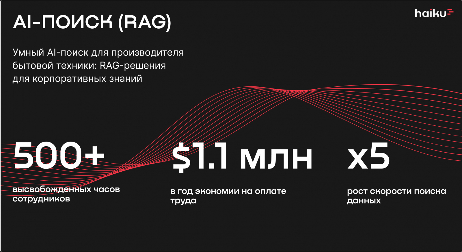 Привет. Мы Haiku— лаборатория ИИ-решений для крупного бизнеса. Мы исследуем, разрабатываем и внедряем ИИ-технологии, а также управляем масштабными ИТ-проектами крупных российских компаний. Сегодня делимся кейсом внедрения ИИ-поиска в бизнес.