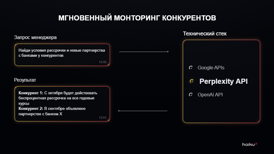 Привет. Мы Haiku— лаборатория ИИ-решений для крупного бизнеса. Мы исследуем, разрабатываем и внедряем ИИ-технологии, а также управляем масштабными ИТ-проектами крупных российских компаний. Сегодня делимся кейсом внедрения ИИ-мониторинга конкурентов в бизнес.