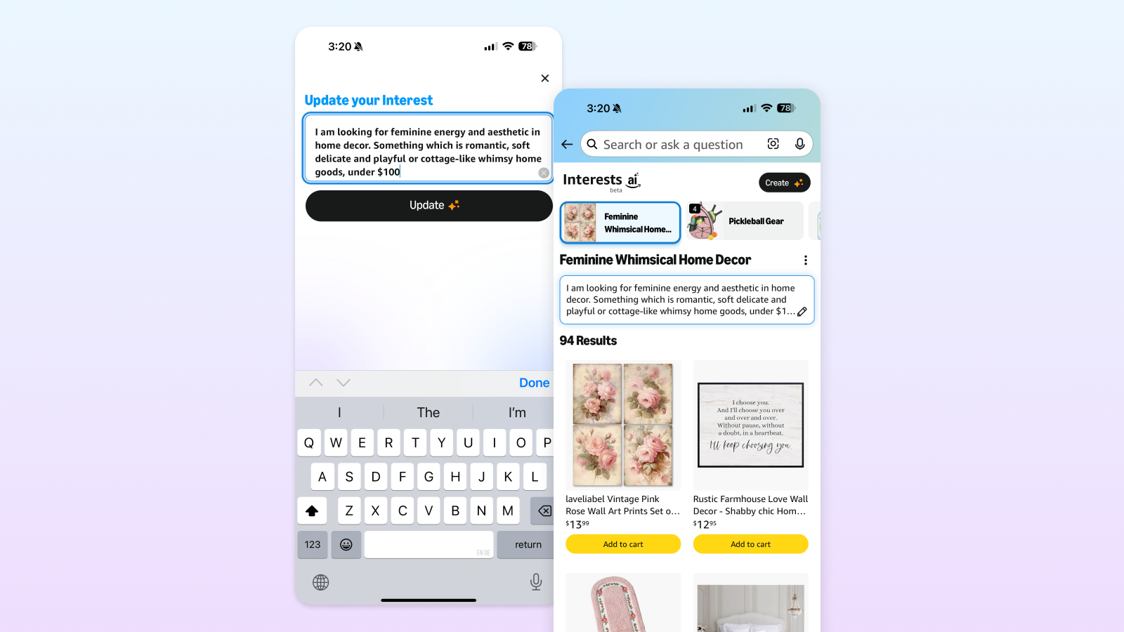В марте 2025 года Amazon представил функцию Interests. Теперь пользователи могут указывать на сайте свои интересы или предпочтения, например, «инструменты для приготовления кофе» или «наборы для инженеров-любителей». Система автоматически преобразует эти данные в поисковые запросы. Функция работает в фоновом режиме: она уведомляет о появлении новых товаров, акциях, поступлении товаров на склад и предлагает персональные рекомендации.