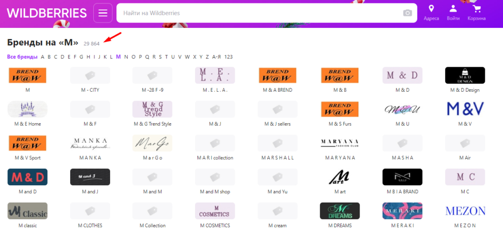 Количество брендов на маркетплейсе огромно. Возьмём для примера бренды на WB, название которых начинается на букву «М», — их более 29 тысяч:
