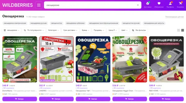 В категории уже есть большие игроки, с хорошими рейтингами, с отзывами, с наработанным объёмом продаж. Эти игроки по умолчанию всегда выше в выдаче, и на рекламу у них деньги есть. Кроме того, в нише идёт борьба за 10-15 рублей чистой прибыли, потому что овощерезки стоят в опте примерно одинаково. Стоимость доставки из Китая не ниже определённого порога, и с маржинальностью особенно не поиграешь.