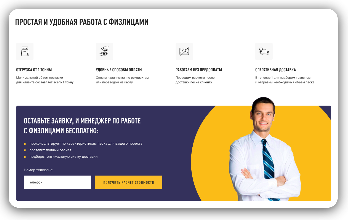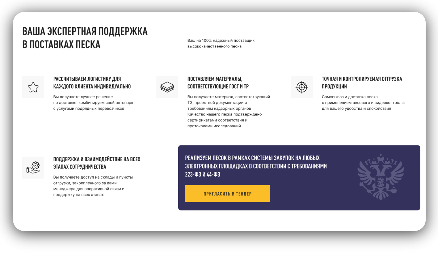На следующих экранах указываются дополнительные выгоды для покупателей, приводятся примеры поставок для различных проектов, размещаются логотипы действующих клиентов.В заключении рассказывается про этапы сотрудничества с юридическими и физическими лицами, размещаются фото и видео с мест добычи песка, карта пунктов отгрузки, ответы на частые вопросы.