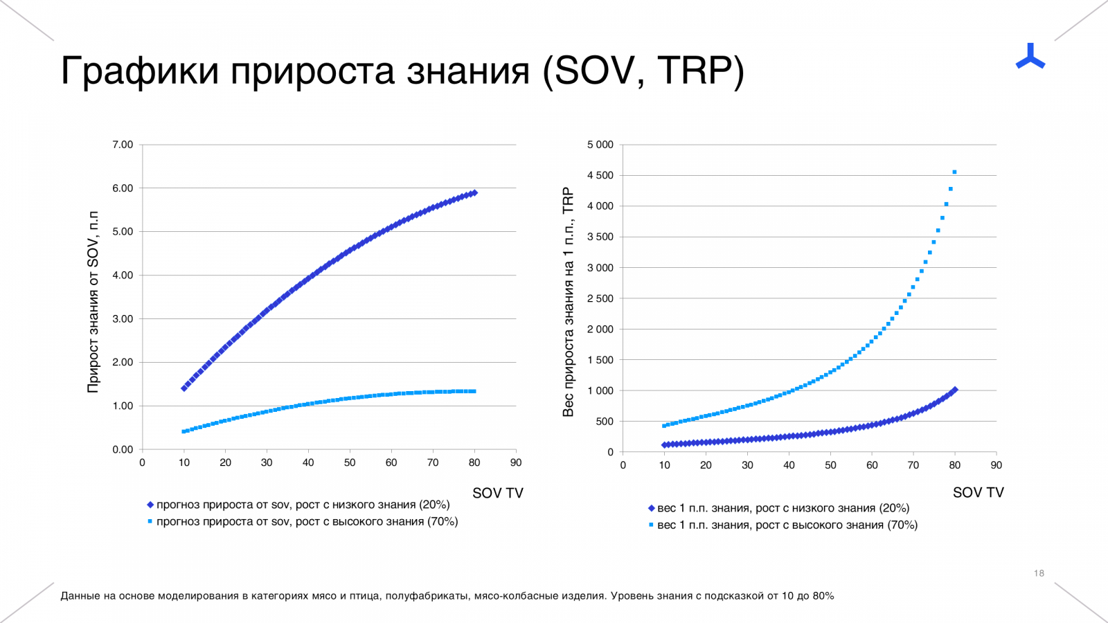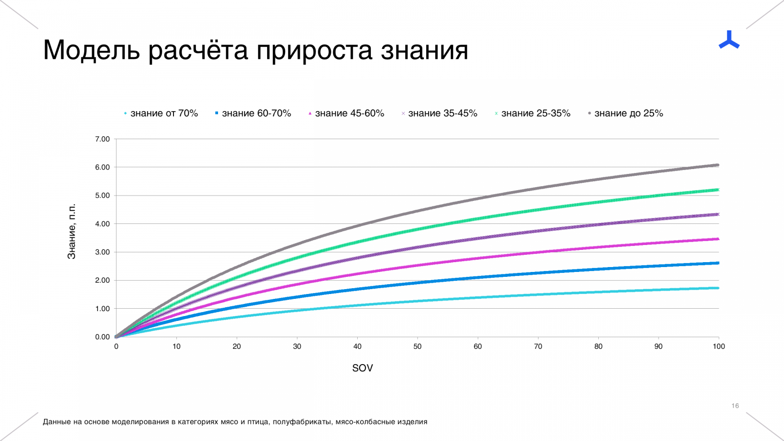 Знание бренда драйвит продажи в FMCG. Этот вклад сильно варьируется в зависимости от продукта, категории, ситуации на полке и других факторов. Стратеги Cube проанализировали мясную категорию (мясо и птица, полуфабрикаты, мясо-колбасные изделия), чтобы выяснить, как строится знание бренда в FMCG и рассчитали модель прироста знания.