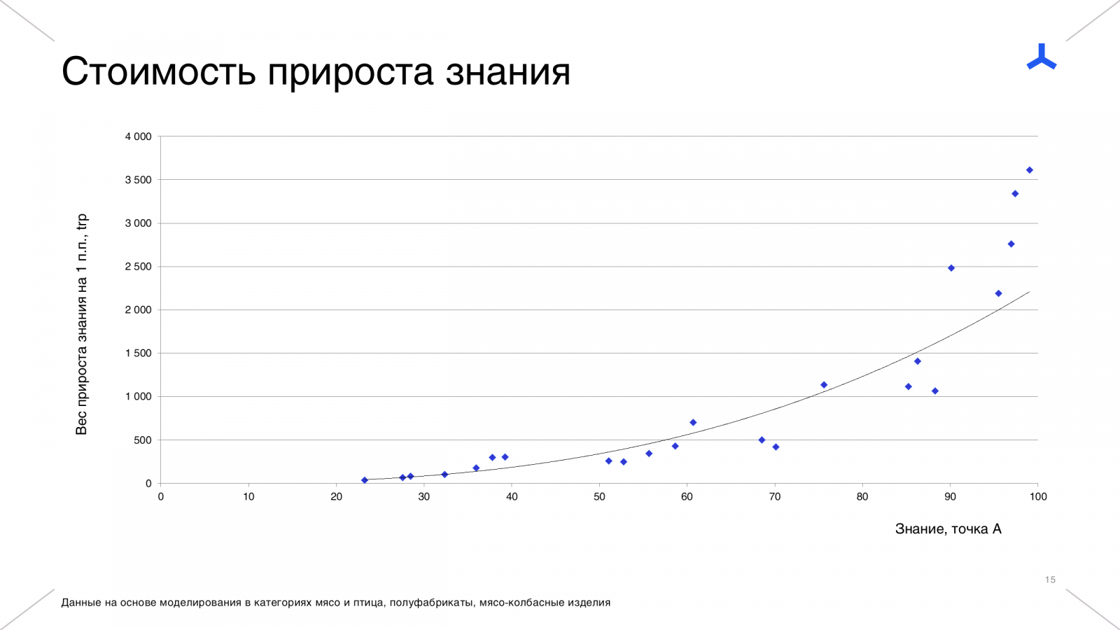 Анализ выявил зависимость прироста знания от доли голоса, мы кластеризовали эти зависимости по базовому уровню знания от 20 до 80% — получилась модель расчёта прироста знания (Рис. 3).