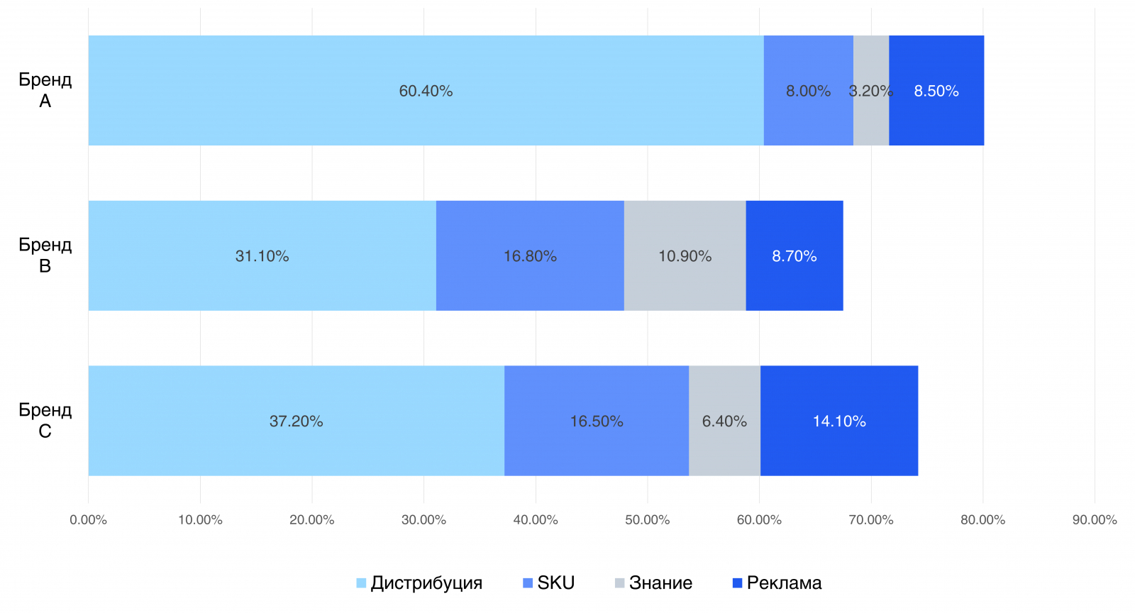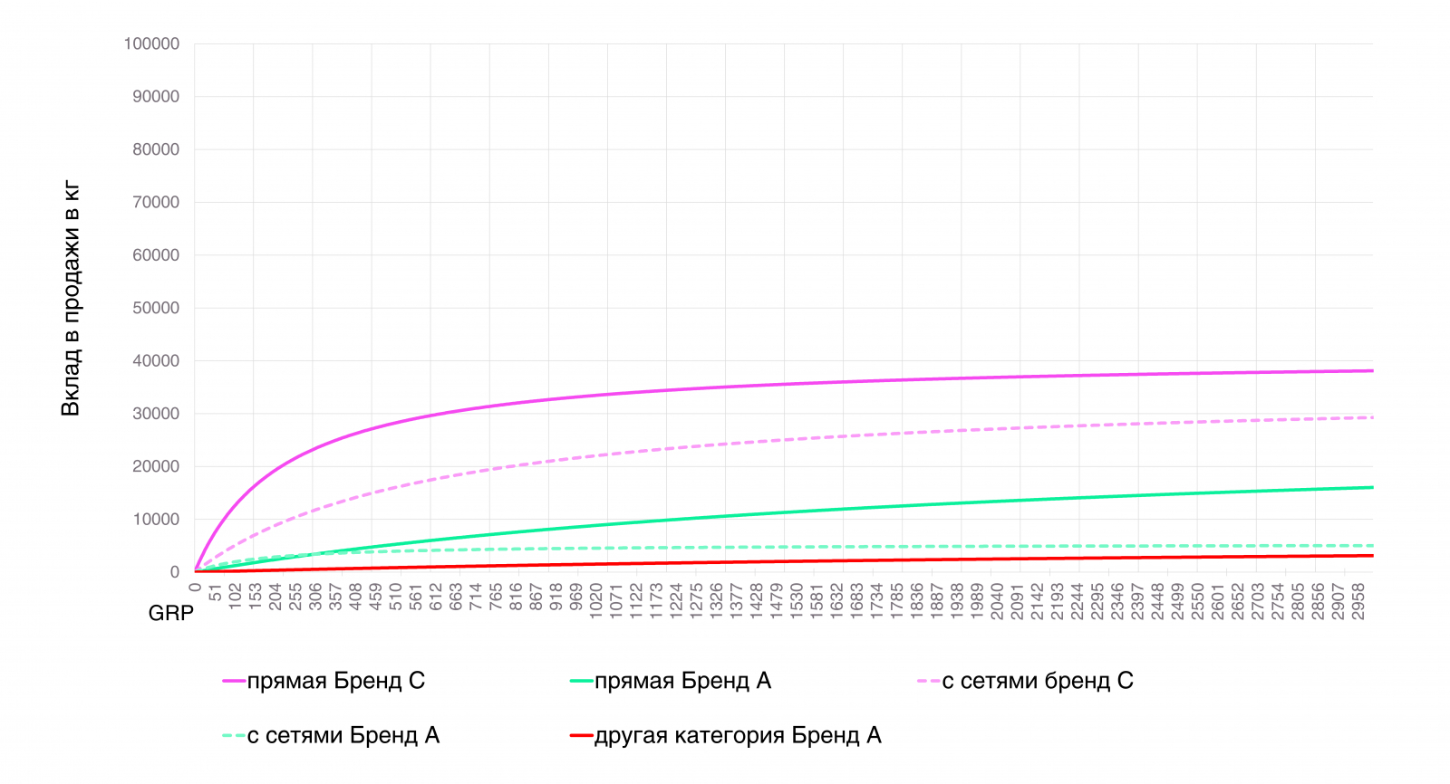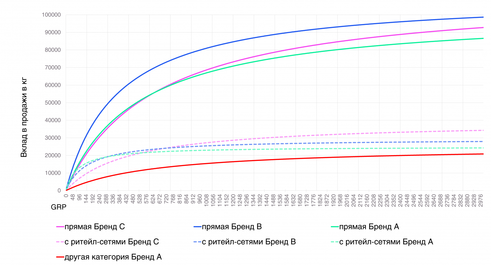 Прямая ТВ-реклама бренда может давать до 80–100 тонн продаж в месяц. Рекомендуемый объём: до 900 GRP/месяц, после прирост продаж замедляется.