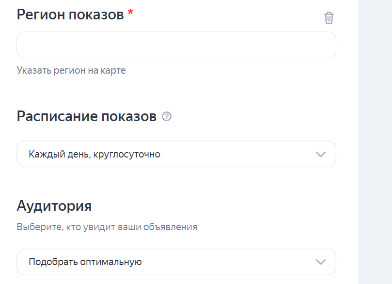 Выберите регион показа рекламы, можно указать район на карте, задав показы рекламы в соответствии выделенной областью на карте.
