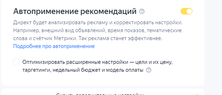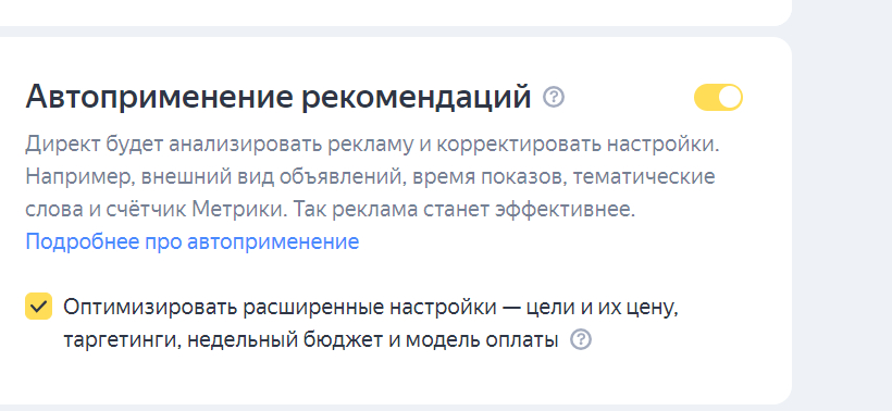 Например, Яндекс может повысить ставки оплаты по каким-то запросам, что увеличит траты. Крайне осторожно рекомендовала бы относится к этой настройке. Кроме того, если есть уверенность в качестве своей настройки - зачем использовать чужие рекомендации?