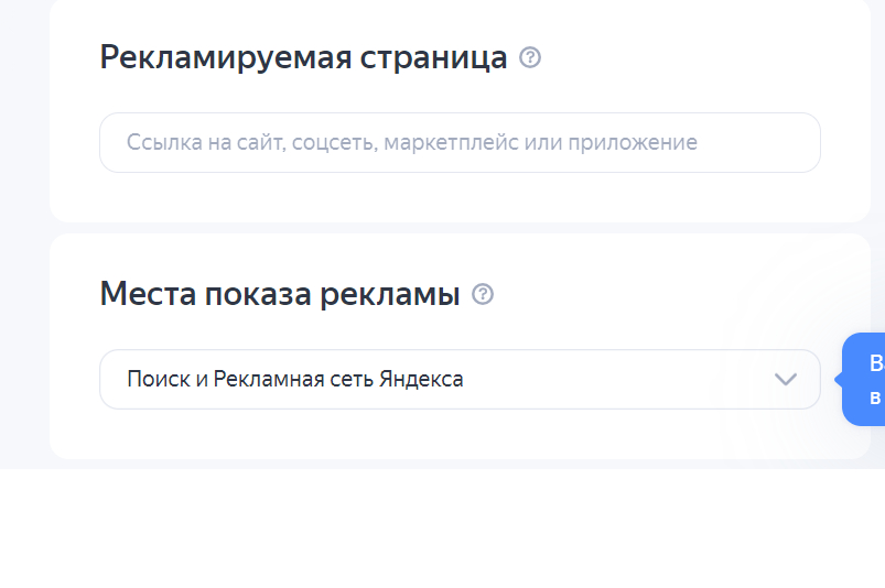 Выбирайте рекламируемую страницу — это может быть сайт, лендинг, страница в соцсети. Место показов — это определение мест, где будет транслироваться реклама. Например, в поиске или на сайтах, который входят в сети Яндекса.