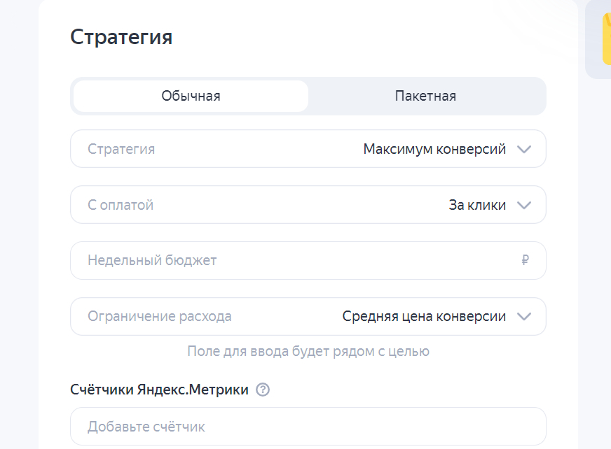 Стратегия имеет огромное значение для настройки рекламы, именно она повлияет на то, как будет оптимизироваться реклама. Чаще всего, наиболее оптимально настроить цель на сайте — такую как нажатие кнопки звонка, оставление заявки, и оптимизировать рекламу по этой цели. Если кнопка звонка и форма есть на сайте.