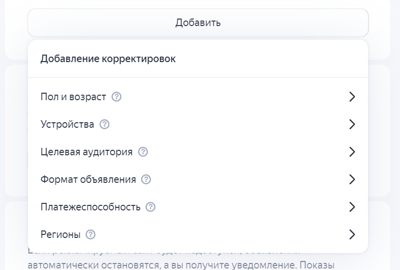 Есть большой список различных таргетингов — возраст, регионы, и другие. Можно, например, настроить повышение или понижение на тех, кто уже посещал ваш сайт (посетители). Чтобы лучше понять, какие коэффициенты применять, проанализируйте прошлую статистику по рекламе, если она есть.