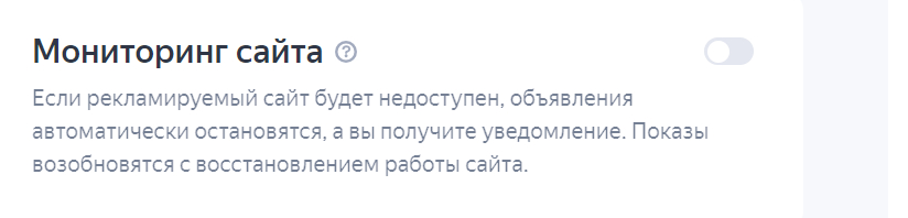 Есть возможность включить защиту от неэффективной траты бюджета при падении, недоступности сайта. Если рекламируемая страница станет недоступна - реклама остановится. В абсолютном большинстве случаев - желательно включать данную настройку.