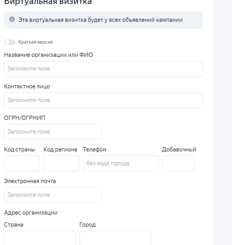 Контакты в рекламное объявление можно добавить не только через Яндекс Бизнес, но и через создание виртуальной визитки в настройках рекламы. Сюда можно внести основные данные про организацию.