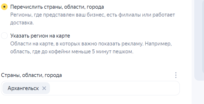 Дальше выберите регион показов, где планируется демонстрировать объявление. В настройках доступна возможность выбрать конкретный город или область, или указать место показа рекламы на карте.