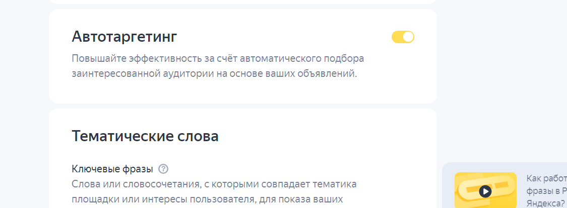 Далее можно выбрать подключать ли автотаргетинг, в настоящий момент отключить автотаргетинг на поиске полностью в настройках невозможно.