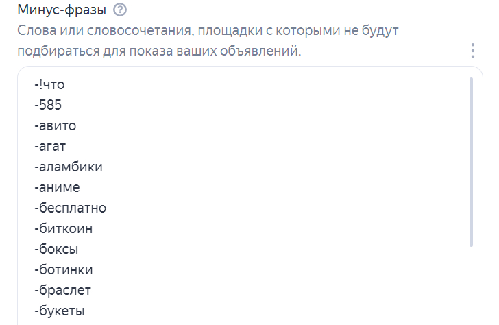 Например, если вы продаете товары и услуги за высокий чек, вы можете использовать минус-слова, такие как "дешевые". Таким образом, по запросам содержащим это слово, показов не будет. Если не исключить такие запросы, скорее всего, конверсия у них в рекламе дорогих товаров и услуг будет очень низкой.