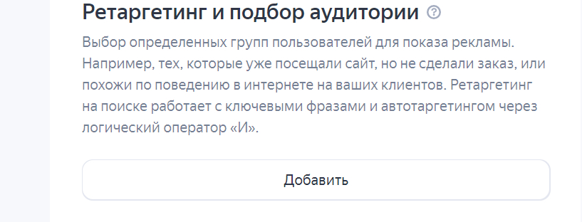 Далее можно выбрать какие-либо интересы аудитории в настройках рекламы (РСЯ), кроме того, если планируется настроить ретаргетинг, есть блок для его настройки.