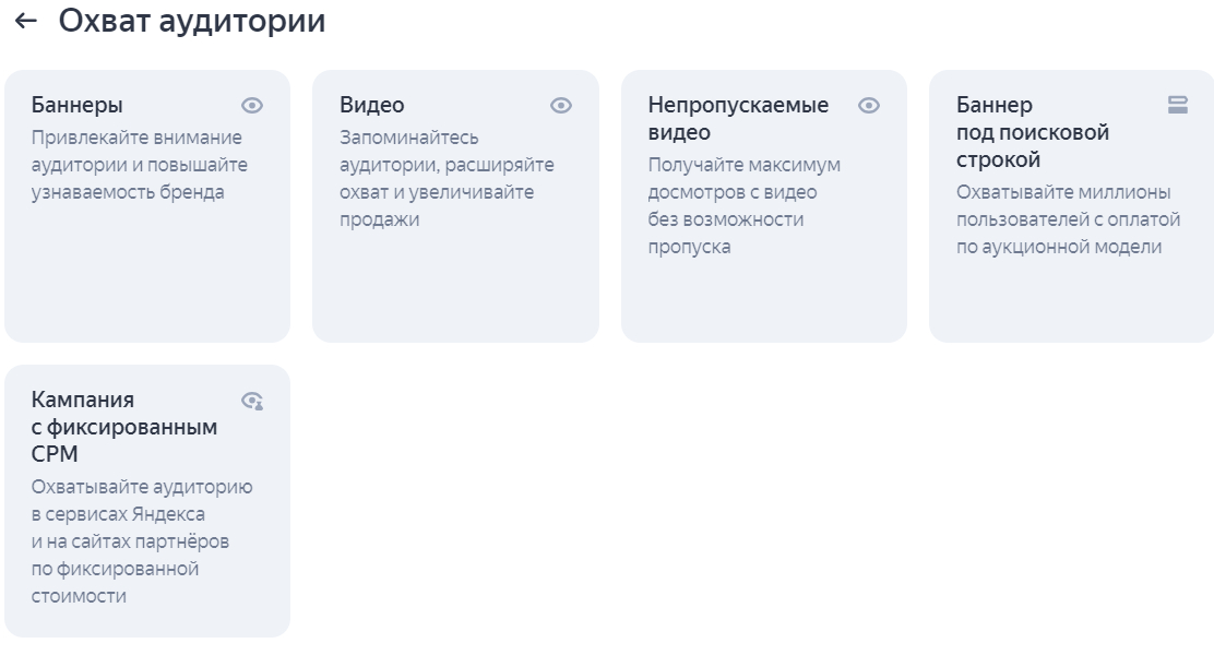 В Яндекс Директе есть тип кампаний, направленный на охват аудитории. Например, размещение баннера или видеореклама.