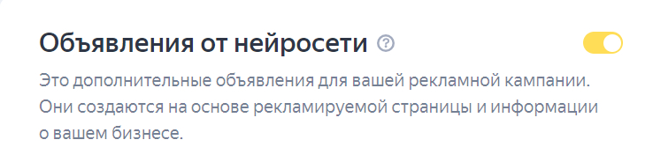Яндекс предлагает выбрать использовать ли дополнительные объявления от нейросети. Подключать ли данную опцию? С одной стороны, на странице настройки указано, что такие объявления получают до 15% больше целевых действий. Но с другой, если вы сделали сами отличное и качественное объявление, зачем полагаться на нейросеть?