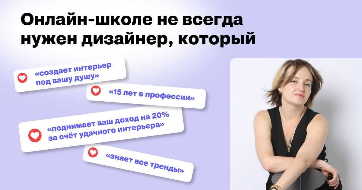 В такой ситуации онлайн-школе не нужен дизайнер, который "15 лет в профессии", "знает все тренды", "создает интерьер под вашу душу" или "поднимает ваш доход на 20% за счёт удачного интерьера".
