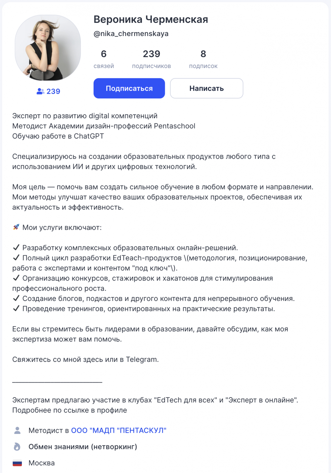 Помните, сейчас онлайн-школы смотрят соцсети экспертов, независимо от канала, через который его нашли или он сам связался с компаний. Это обычная процедура, которая позволяет понять, подходите ли вы со специалистом друг другу, удастся ли вам найти общий язык. Поэтому тем, кто хотел бы сотрудничать с EdTech-компаниями, стоит оформить хотя бы одну профессиональную страницу, которую можно будет предоставить специалистам для подтверждения экспертности.