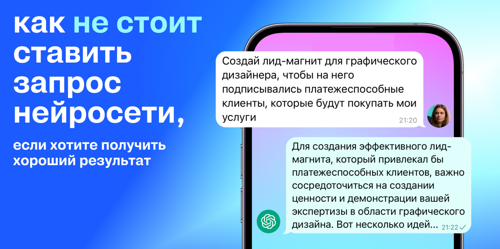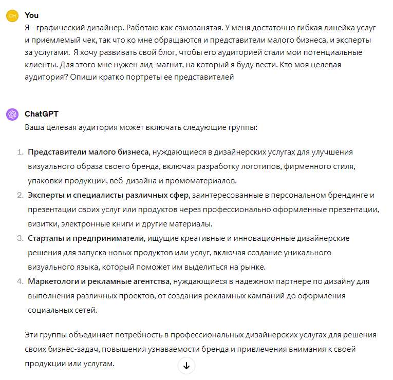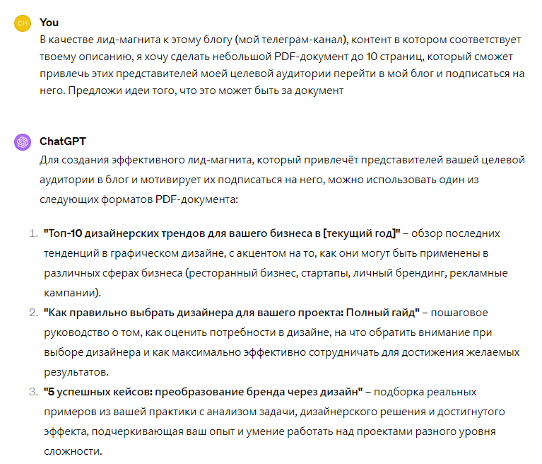 В качестве примера будем создавать лид-магнит для блога графического дизайнера. Но в целом, эти же советы подойдут для создания любого материала экспертам из разных ниш. Кстати, ранее мы рассказывали, как ChatGPT помогает создателям обучающего контента.