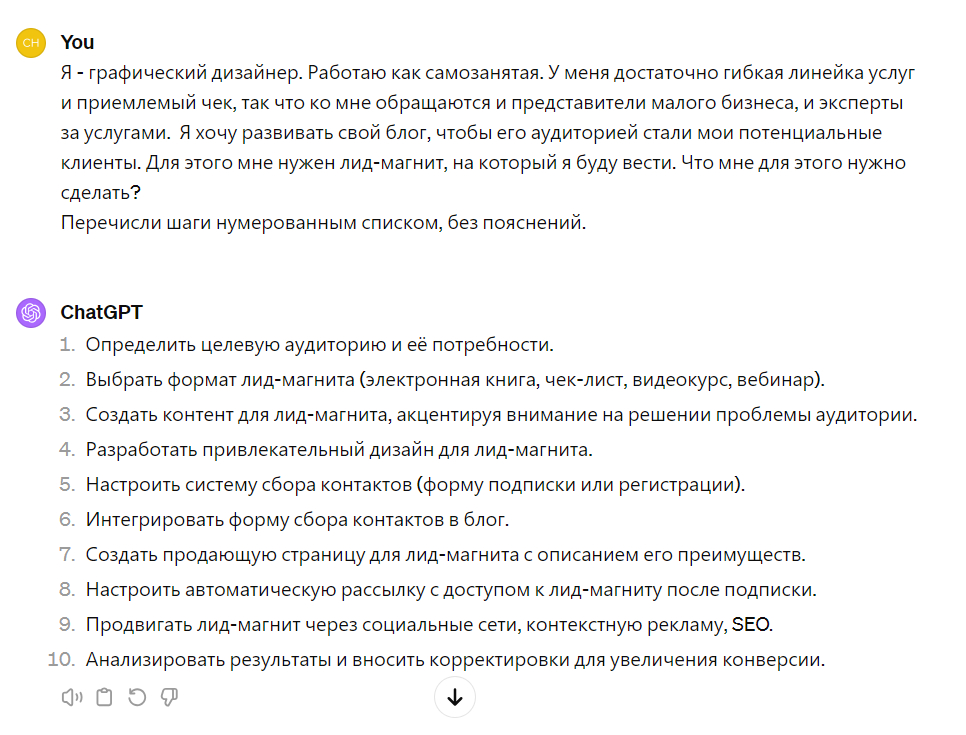 И только теперь, когда у нас есть понимание того, кто и зачем будет приходить в наш блог, мы можем приступить к генерации идей лид-магнита. Как видите, есть большая разница между тем, чтобы просто спросить у ИИ идеи и задать ему конкретный контекст, в котором он должен помочь вам сориентироваться.
