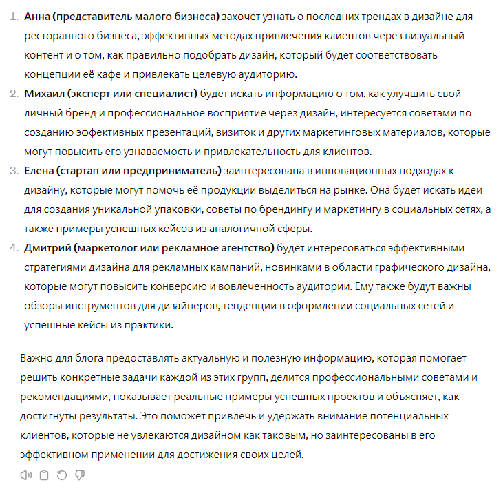 Думаем, шутка про заказчиков, которые уверены, что их целевая аудитория — это все люди мира, актуальна для многих. Чтобы самому не стать таким экспертом, который создает блог и контент «для всех» мы должны понять, кто именно наша целевая аудитория. И уже на этом этапе можно использовать нейросеть.