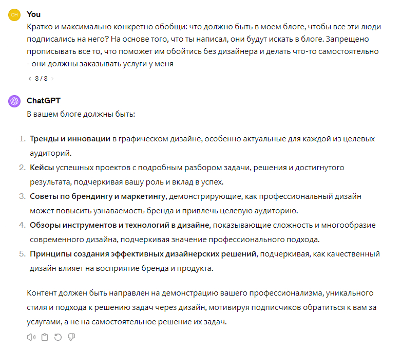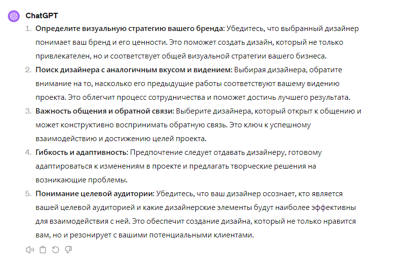 Здесь мы категорически против того, чтобы просить ИИ подсказать, какие тренды в дизайне существуют, как правильно выбрать дизайнера на проект и что вообще можно написать внутри выбранного формата.