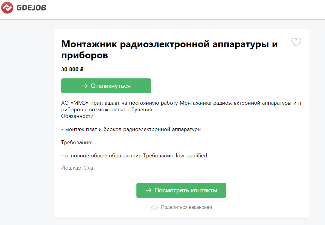 Как вы думаете, какая зарплата должна быть у специалистов, занимающихся выпуском оборонной продукции? Так Марийский машиностроительный завод предлагает монтажнику радиоэлектронной аппаратуры и приборов зарплату в 30 тысяч рублей.