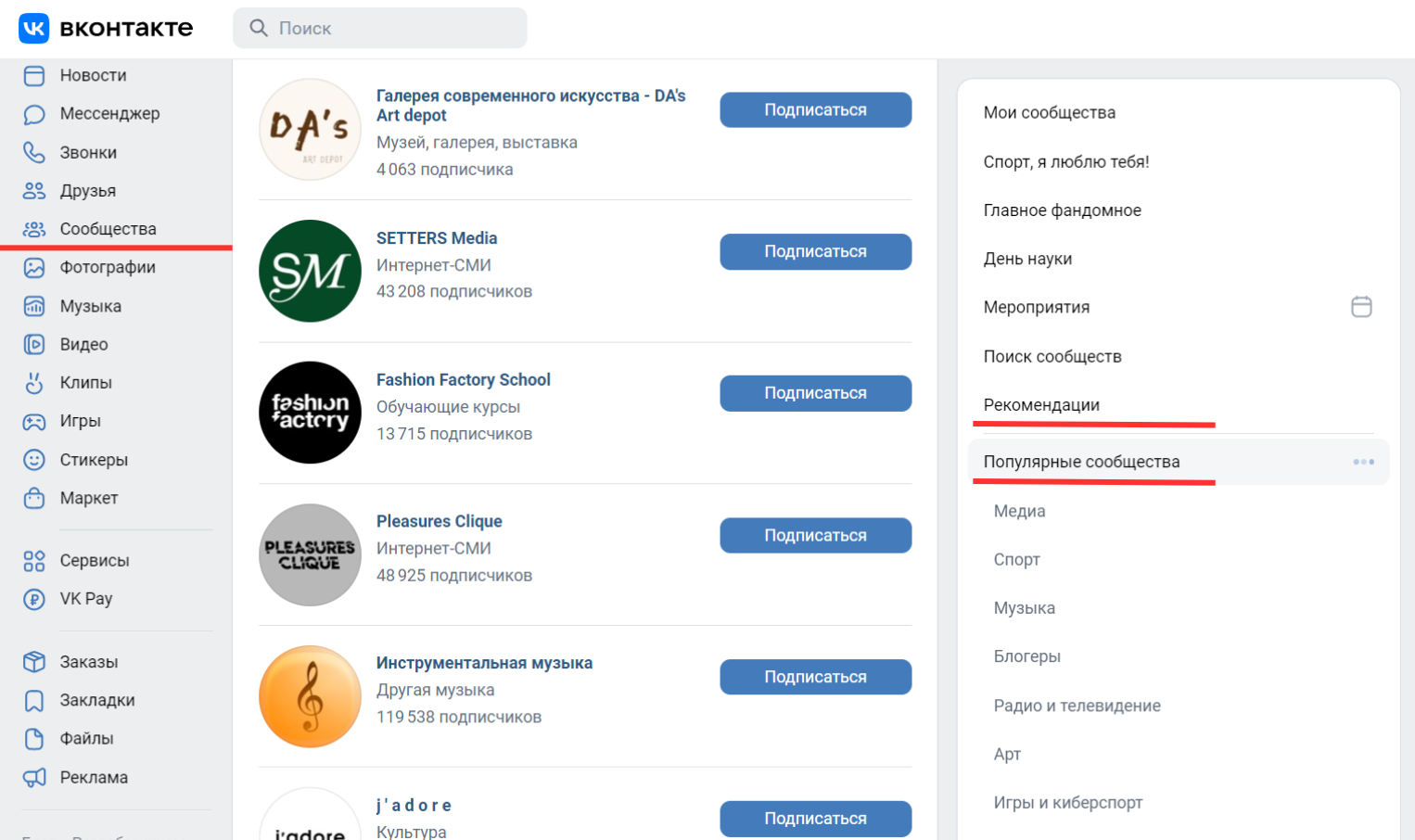 Преимущество посевов ВК в данном случае в том, что вам не нужны сторонние сервисы и агрегаторы по поиску. Достаточно открыть раздел «Сообщества» и выбрать наиболее подходящую группу.