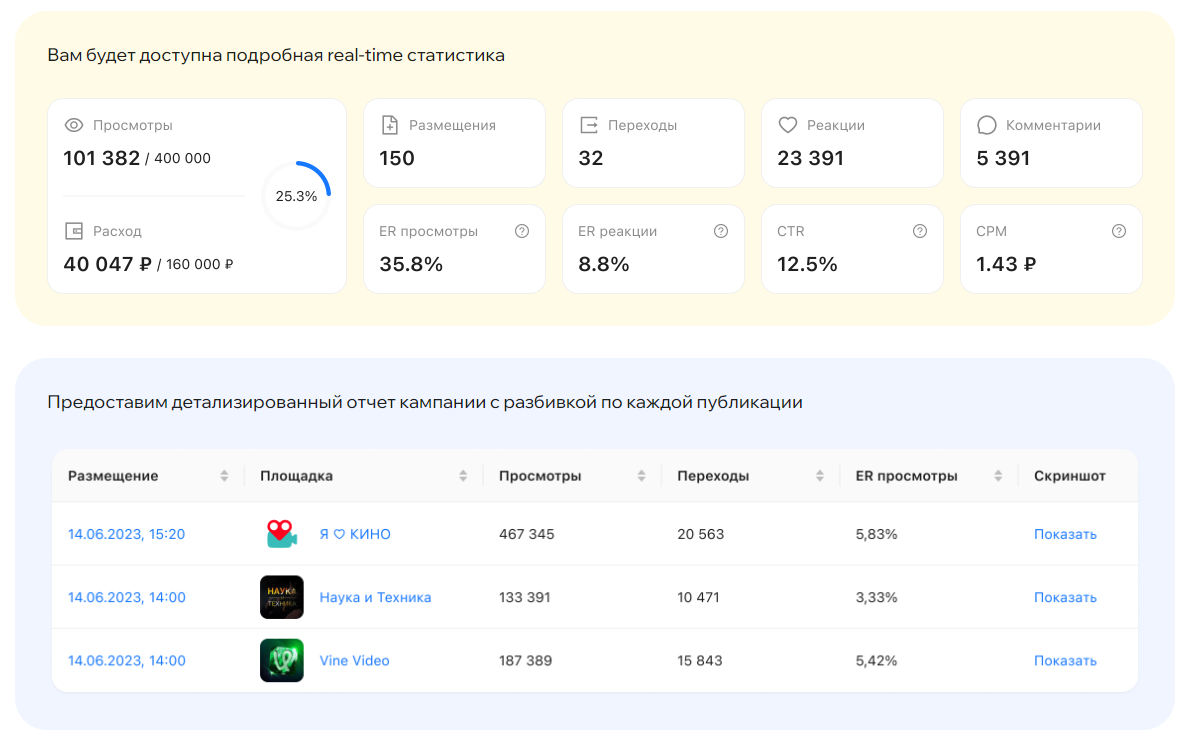 – умный дашборд с подробной статистикой (она доступна во время и после окончания рекламной кампании);