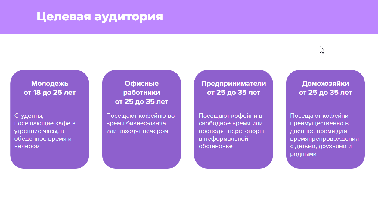 1) Мы выделили ключевые сегменты целевой аудитории, которые являются частыми клиентами кофеен, выбрали 6 крупных городов в разных частях страны для реализации рекламной стратегии: Москва, Санкт-Петербург, Самара, Ростов-на-Дону, Екатеринбург, Сочи, Ярославль. Именно на них ориентирована рекламная кампания и лид-магнит.