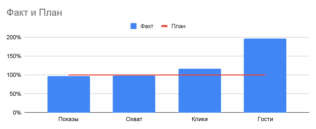 Плановые показатели по показам и охвату были выполнены на 100%, по количеству кликов — на 119%, по количеству гостей — выполнены на 197%.