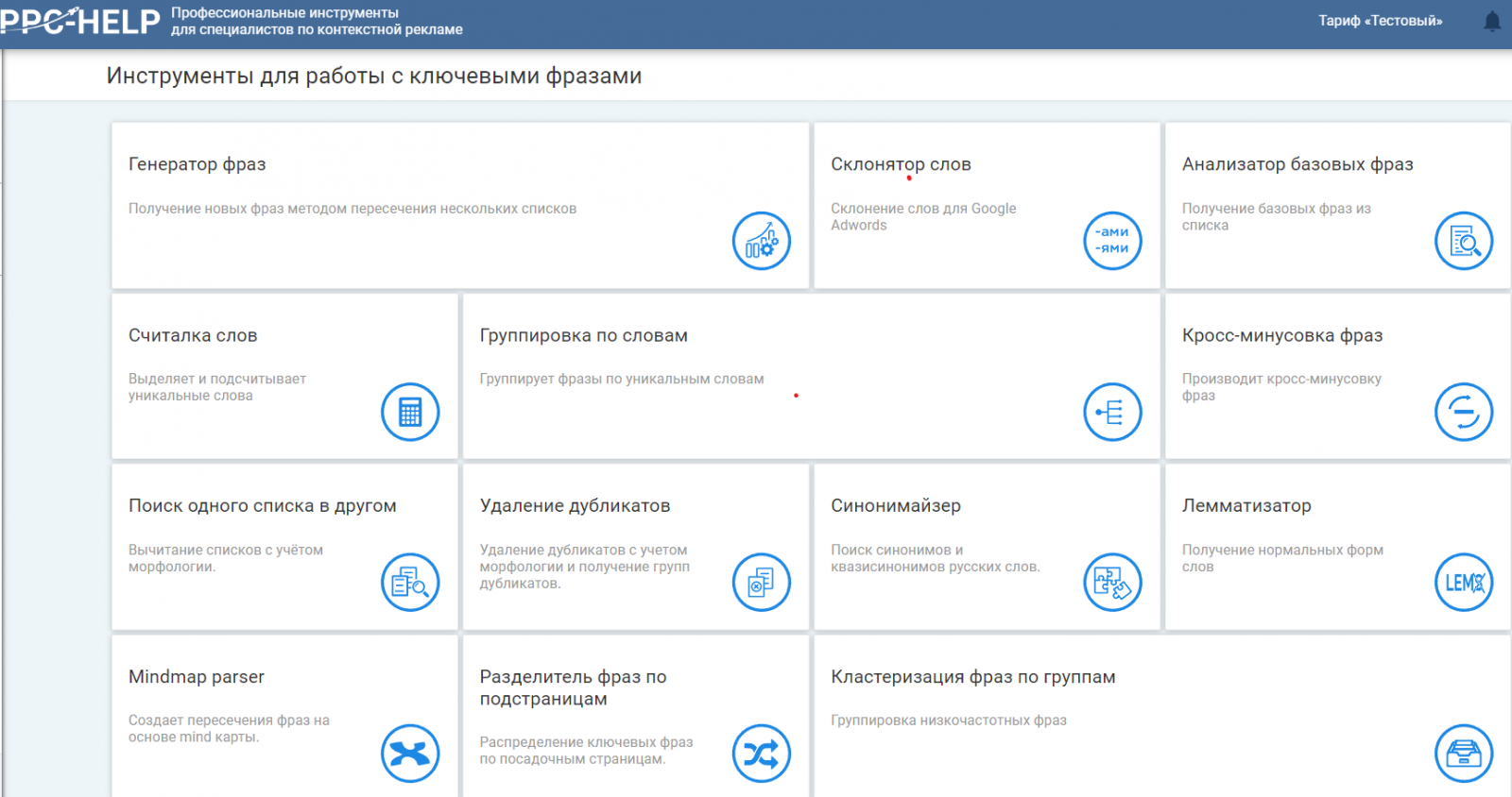 4. PPC Help — это инструмент для изучения ключевых слов, который в значительной степени ориентирован на рекламные кампании и контекстную рекламу (PPC), что позволяет анализировать эффективность ключевых слов в рекламных объявлениях. Кроме того, сервис предоставляет множество возможностей для анализа, подбора синонимов и минус-фраз, группировки, кластеризации ключевых слов.