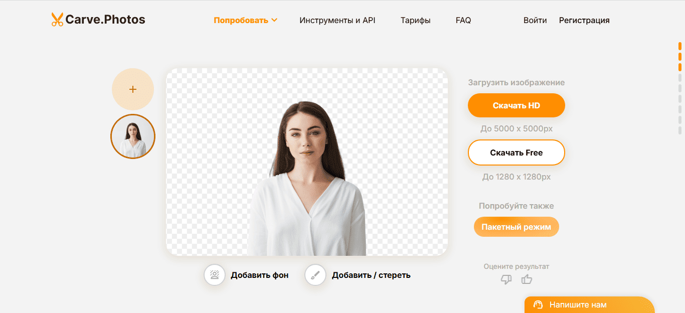 Этот сервис также можно использовать для экспресс-подготовки фото на документ или например для оформления стикеров в соцсеть. Для этого в Carve.photos предусмотрен пакетный режим — можно загрузить до 100 иллюстраций и автоматизировать работу с фотофоном. Онлайн-редактор отличается нестандартным рабочим полем: все исходники расположены в левой панели в виде кружочков с превью, редактируемый снимок — в основной части интерфейса.